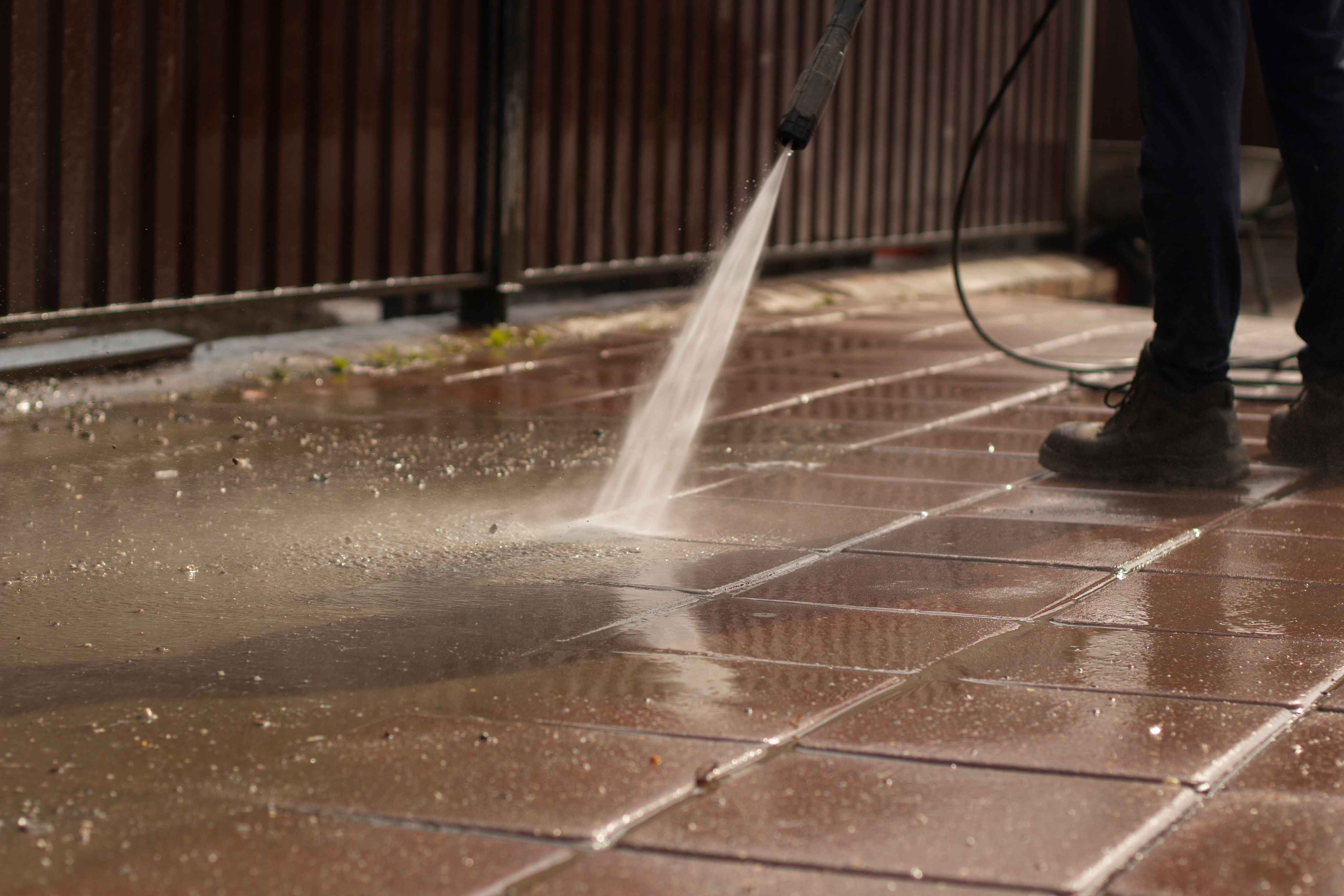 Décapage et remise en état des terrasses grâce à un nettoyage haute pression (Karcher).